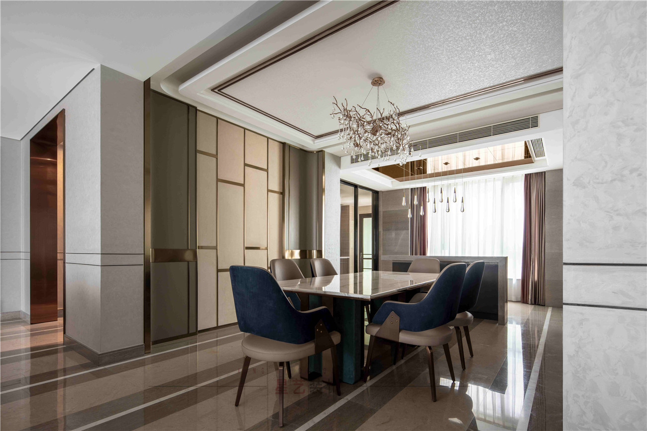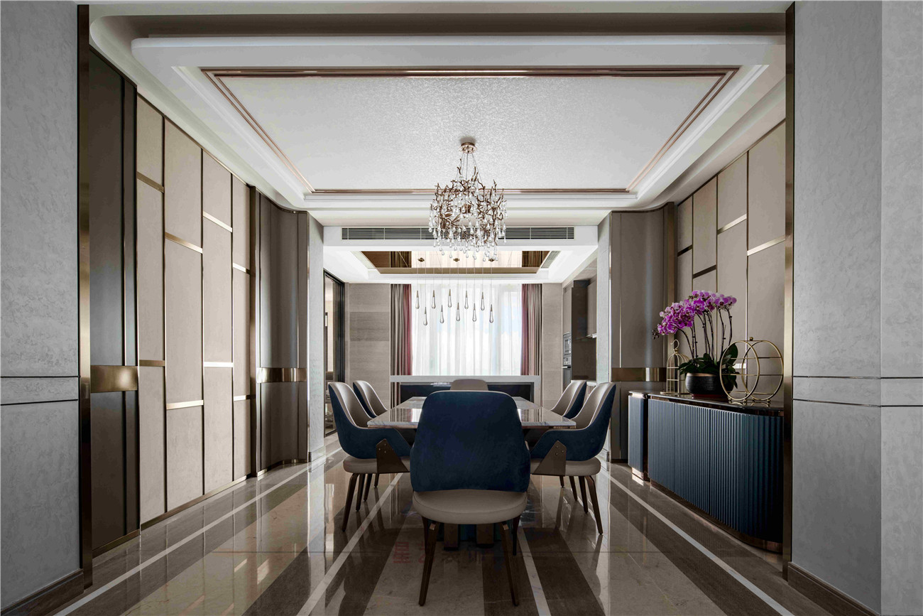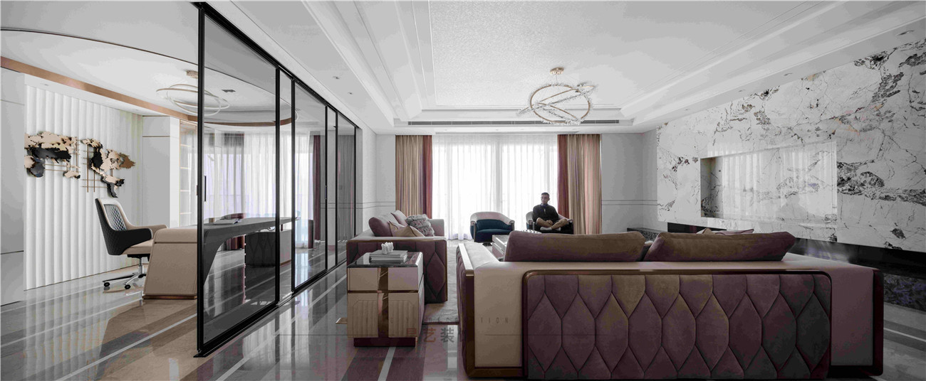 本案設計是位于海珠區380㎡的住宅,擁有無敵景觀一視野,業主90后,準備做婚房,要求輕奢,鐘愛石材,金屬和皮質的家居風格,敞開式書房通過隔斷可移動屏風于客戶區域串聯起來,可開可隔斷的靈動組合,最大的強化空間包容及開闊性,用中西結合的方式為即將到來的婚姻生活帶來更高的幸福指數,打造溫馨的生活環境。
