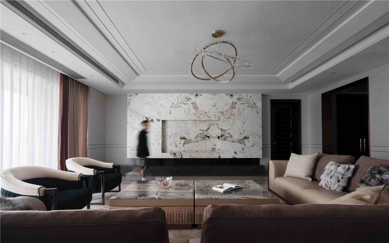 光滑有質感的沙發,搭配上同色系的矮桌讓整體的色調更加協調,而且帶有弧形的深色絨面座椅,和精心設計的圓形吊燈,打破了四四方方桌子和沙發帶來的頓感,如潑墨山水般的人大理石紋理給整個客廳增添奢華的格調。