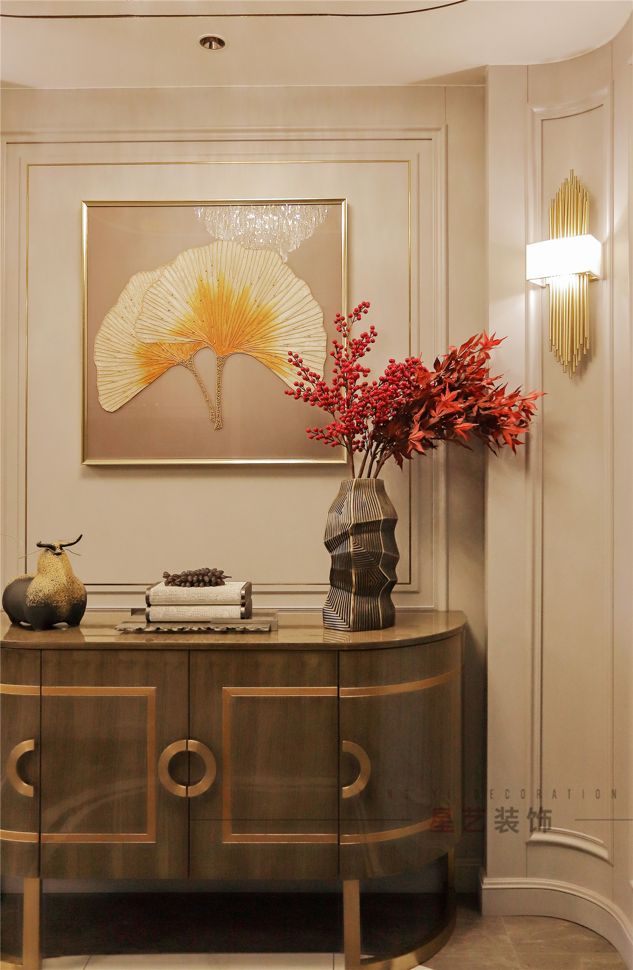 而實(shí)景中卻讓人眼前一亮,打開(kāi)門的一瞬間好像回到了落葉繽紛的秋季,紅豆代表思念,楓葉是回憶和堅(jiān)忍的象征,銀杏則代表永恒的愛(ài),陶瓷擺件和不規(guī)則花瓶也是設(shè)計(jì)師別出心裁的部分,提升了整體設(shè)計(jì)的文藝氣息。