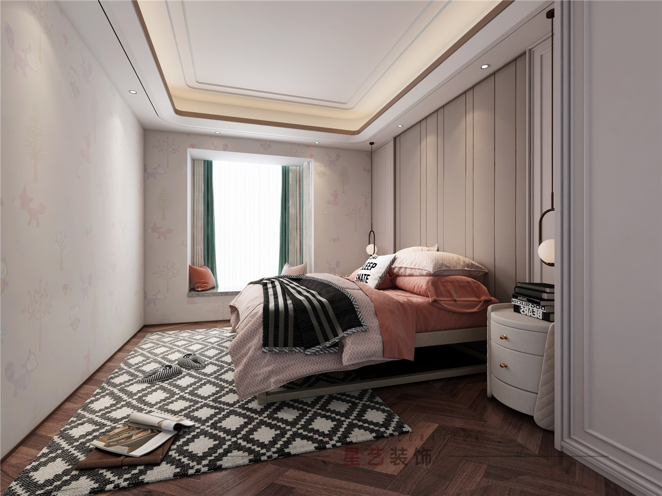 效果圖中的男孩用了大量的黑白灰設(shè)計(jì),也是男孩子普遍比較喜歡的簡(jiǎn)約設(shè)計(jì),稍微有些凌亂的擺放也增添了生活的氣息。女孩房的效果圖中給人感覺(jué)非常溫馨舒適,墻上得狐貍圖案也顯得活潑俏皮。