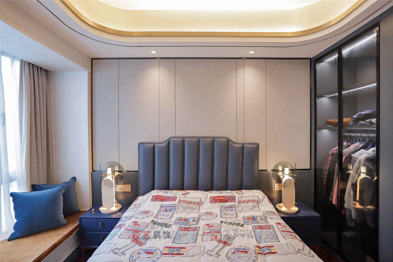 男孩房的實(shí)景中則是用了看藍(lán)色調(diào)做渲染,被子的英文海報(bào)圖案和設(shè)計(jì)干臺(tái)燈增加了臥室的潮流感,也有用到對(duì)稱的元素,大氣簡(jiǎn)約。