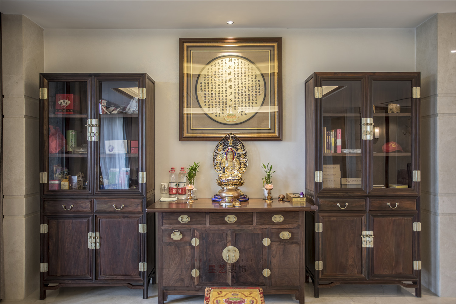 香案兩邊就是置物柜,每天都可以靜下來心來讀經,靜坐。兩兩對稱,四平八穩(wěn)的長桌置物架放一對木雕大象擺件,在傳統(tǒng)文化中,象與祥字諧音,因此象也被賦予了吉祥的寓意。