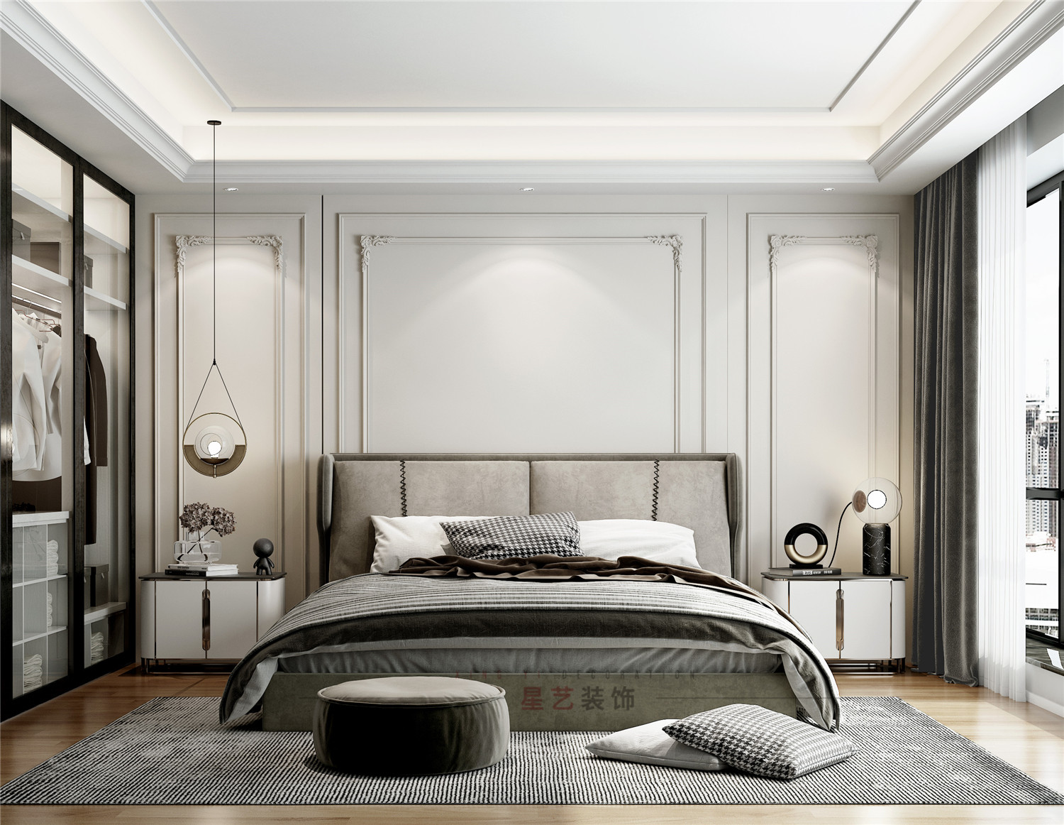 主臥用大面積灰調與對稱的設計,沉穩高級。簡約之中,又有無盡的雅致與濃厚的生活氣息。