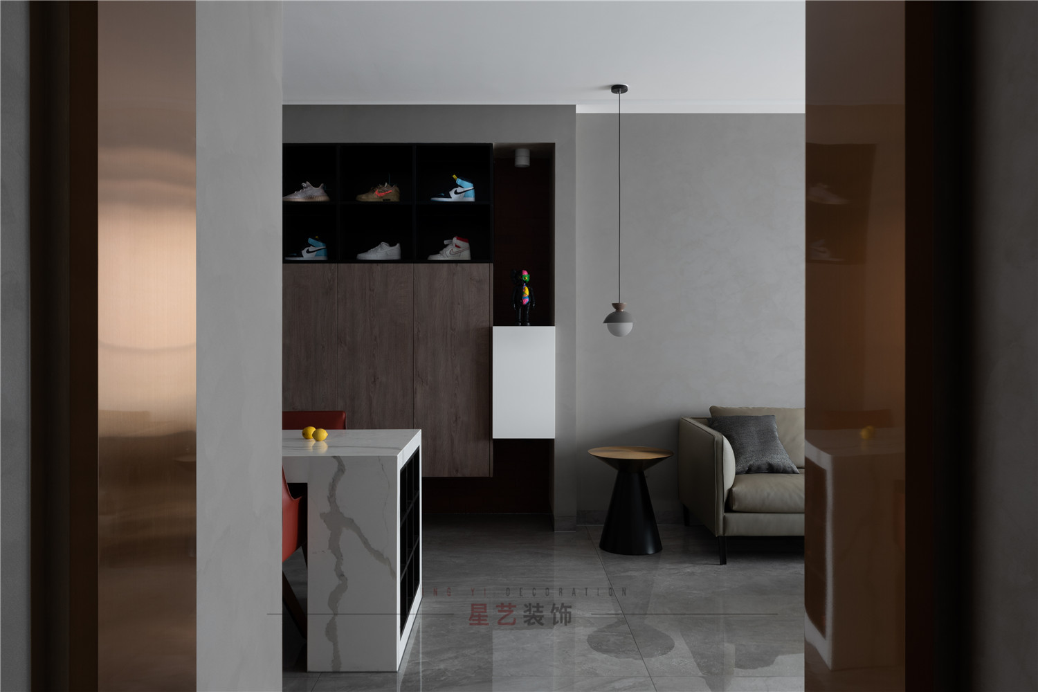 此項目業(yè)主是一個單身男士喜歡收藏些手辦模型玩具和潮鞋一直有個動漫宇宙幻想。設(shè)計師以宇宙金星為主題展開設(shè)計,從材質(zhì)上運(yùn)用了灰色凹凸感涂料象征金星的地表質(zhì)感,用金色鏡鋼象征了金星特有的順色,黑白色的巖板代表了宇宙的光明和黑暗。