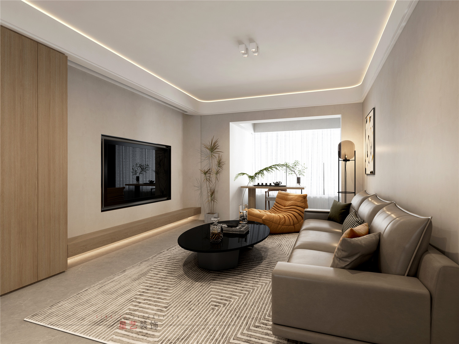 四季素淡,清淺而行。客廳總能集聚歡聲笑語,以米色為底色,簡單素凈,加以橘色沙發(fā)做點綴,如身臨一程秋色,撞進了秋的序幕;一盞茶,一首歌,舒適愜意,怡然自得。