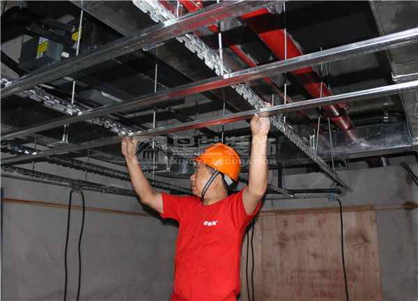 B、主龍骨安裝:主龍骨扣在吊桿上,并用螺母鎖緊。